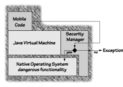Usually a security exception propagates up through all the methods of the thread that made the disallowed call. When the topmost method finally gets the exception, the thread exits. A thread that exits this way prints the exception and the stack trace of all the methods that led to it. These are the sorts of messages often cut and pasted in comp.lang.java.security by Java developer newbies wanting help with security problems. One important thing to realize about security exceptions is that it is perfectly possible for a hostile applet to catch any security exceptions it generates in a try/finally block. So don't count on security exceptions to tip you off to hostile applet activities. Purported Java security products that count security exceptions can easily be thwarted by this strategy. A hostile applet can thus probe your Security Manager with impunity. (Besides, a cracker who has done his homework will know in advance what your Security Manager will allow and disallow, so he will never bother trying to make a call that causes a security exception.) The Security Manager is completely customizable (through subclassing), although applets are not allowed to install Security Managers. A default Security Manager is provided (like the Class Loader) as a template from Sun Microsystems. Each Java-enabled application fills in the template (by subclassing the template class) to meet its own security requirements. The Java runtime library is written so that all requests to perform dangerous operations are referred to the Security Manager. Access checks are used for thread access, OS access, network access, and Java component access.